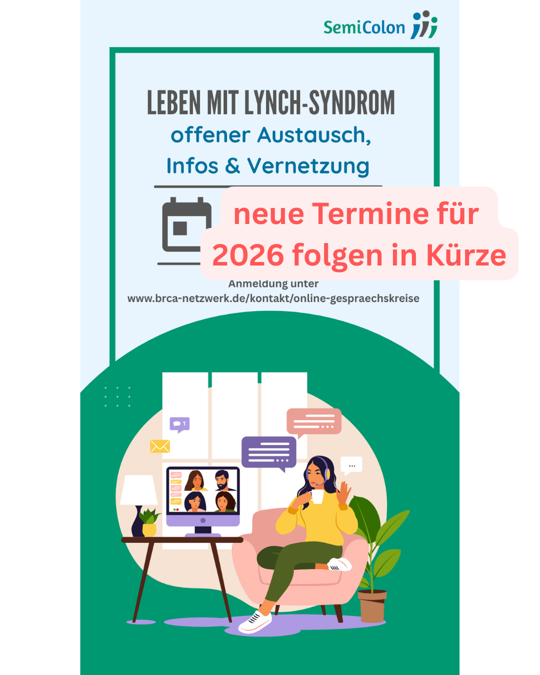 Das BRCA-Netzwerk bietet weitere themenspezifische Gesprächskreise an, z. B. zum Thema Entscheidungsfindung: Lasse ich mich testen? Kommt für mich eine prophylaktische Operation in Frage? … ? oder zum Thema Kinderwunsch bei vererbbaren Krebserkrankungen. Alle Termine und die Anmeldung zu den Online-Gesprächskreisen findest du hier.